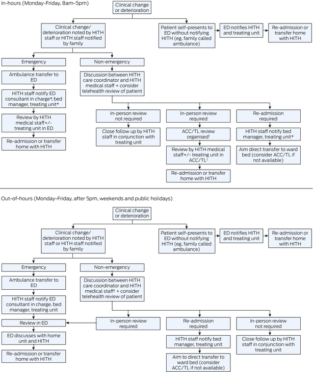 ACC = ambulatory care centre; ED = emergency department; HITH = hospital‐in‐the‐home; TL = transit lounge. * to be performed by HITH medical staff in‐hours. † if out‐of‐hours, follow out‐of‐hours flowchart. ‡ HITH medical staff may include residents on site or consultants on call. Source: used with permission from The Austin Hospital‐in‐the‐Home service, Melbourne, Australia.