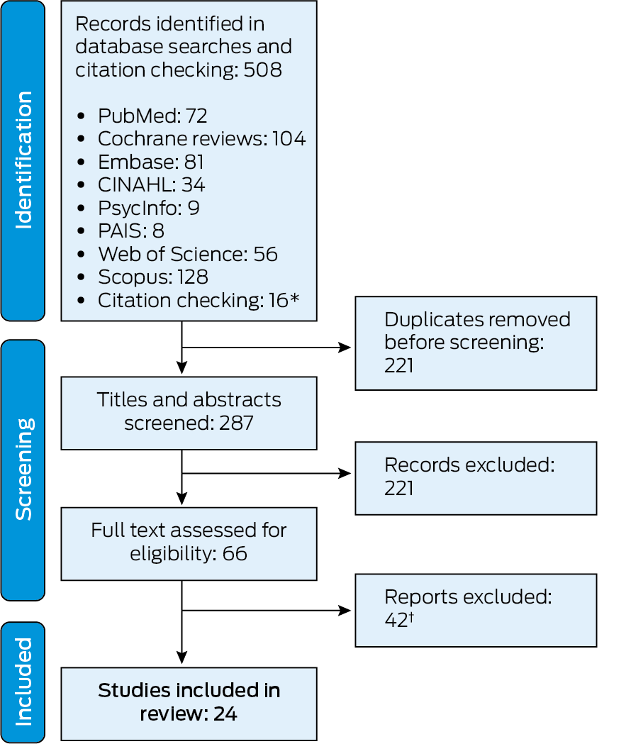 The database searches and bibliography checks identified 508 potentially relevant articles. After removing duplicates and screening their titles and abstracts, we reviewed the full text of 66 articles; 24 met the inclusion criteria for our scoping review (Box 1, Box 2).23,24,25,26,27,28,29,30,31,32,33,34,35,36,37,38,39,40,41,42,43,44,45,46 Twenty‐two of the included studies were undertaken in fifteen countries: eleven in Canada, four in Australia, two each in the United Kingdom and New Zealand, and one each in Ireland, the United States, and France. One publication compared schemes in twelve countries (Denmark, France, Germany, Ireland, Israel, Italy, the Netherlands, Norway, Canada [Ontario], Sweden, Switzerland, United Kingdom), and one was a rapid review. The four Australian articles38,40,45,46 described trial interventions; they were included because of the similarities of the interventions with MyMedicare. Several schemes operate concurrently in Canada42 and Ireland,23 facilitating a degree of practitioner and consumer choice, and model comparison.
