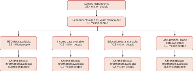 Of the 25.4 million people for whom 2021 Australian census data were available, 12.3 million were aged 40 years or older, of whom 6.4 million (52%) were women. Residential and socio‐economic position data that allowed IRSD categorisation and health status responses were available for 11.3 million people in this age group (92%) (Box 1).