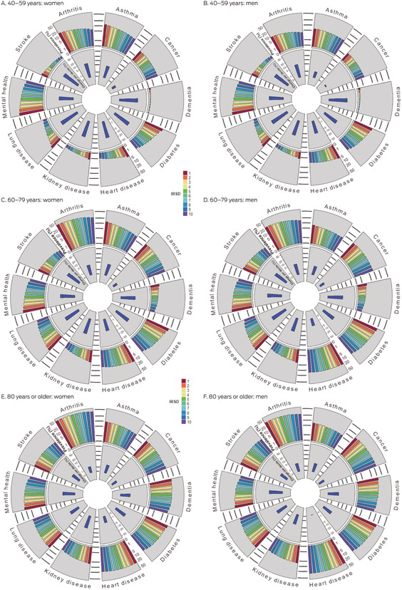 Box 2 – Age‐standardised prevalence of ten chronic diseases by Index of Relative Socioeconomic Disadvantage (IRSD) decile (outer circle), and mean proportional change in prevalence per one decile decrease in IRSD (inner circle), by sex and age group*