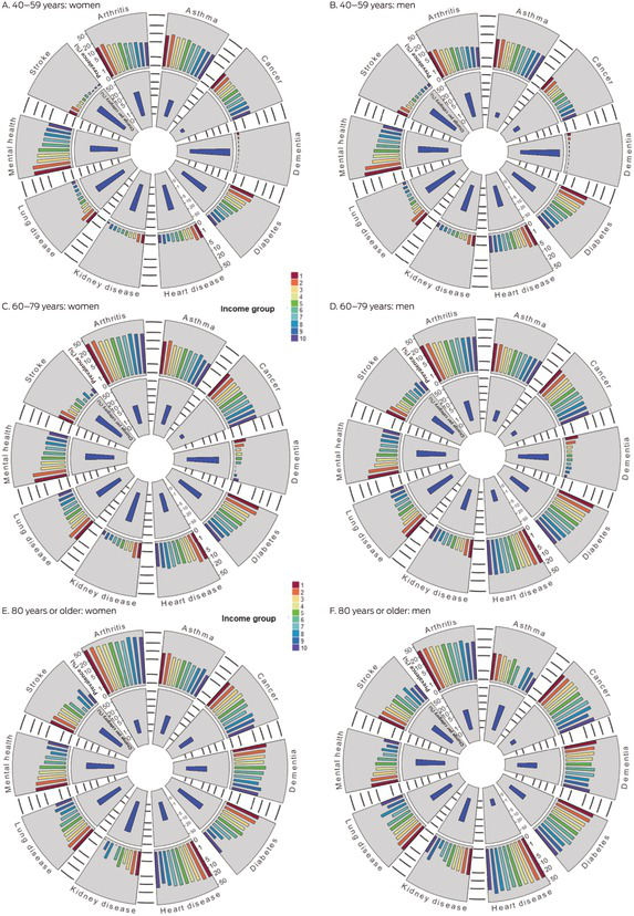 Box 3 – Age‐standardised prevalence of ten chronic diseases by weekly income category (outer circle), and mean proportional change in prevalence per one category decrease in income (inner circle), by sex and age group*