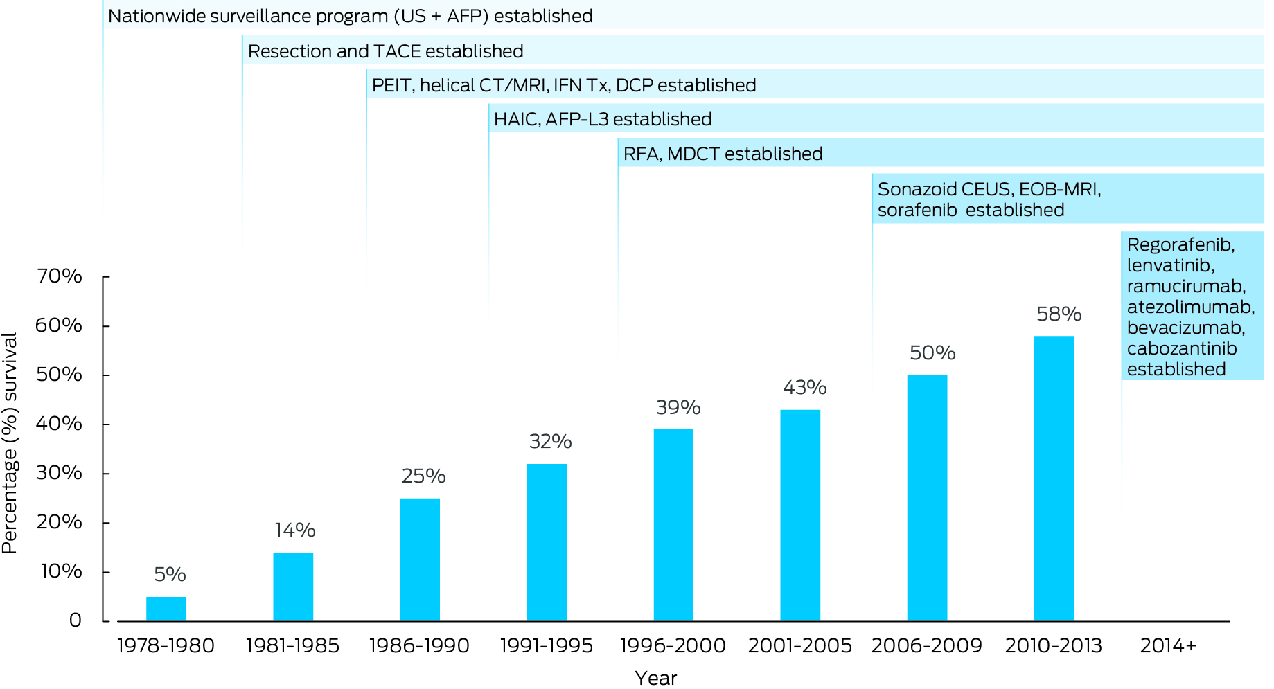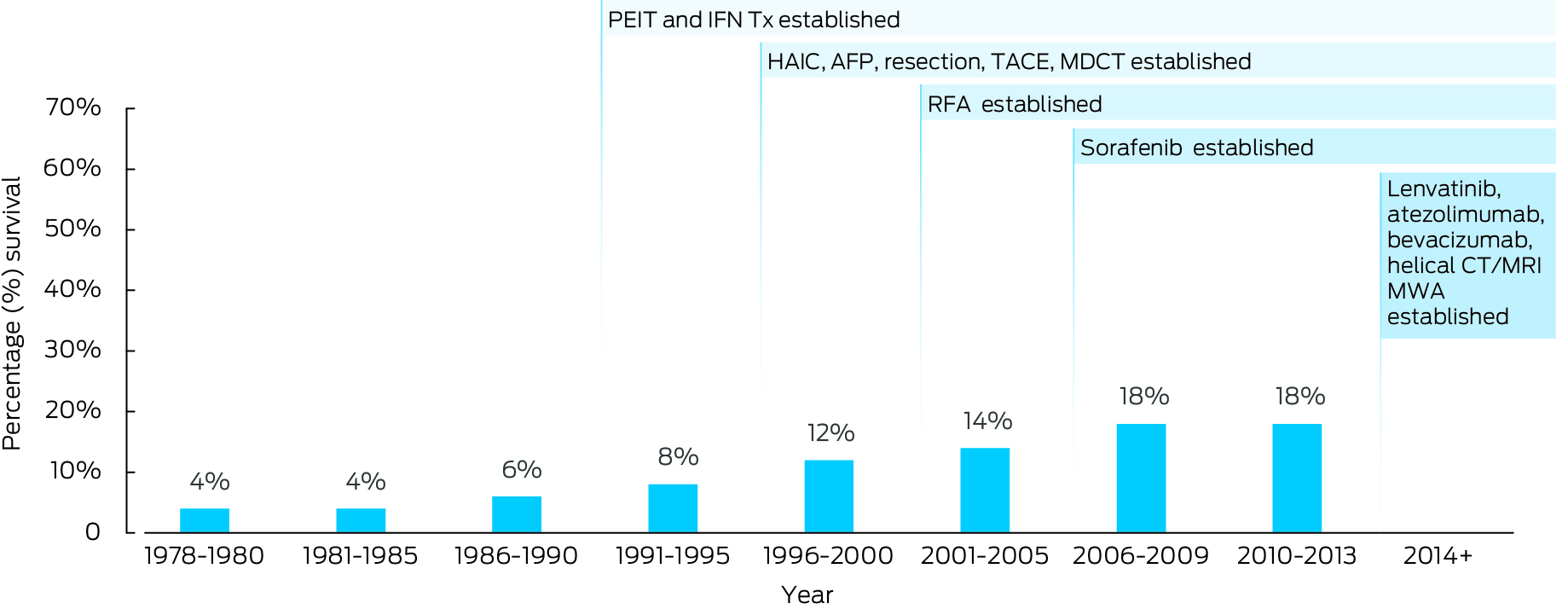 Yet, in some east Asian countries, between 2000 and 2020, both the incidence and mortality of primary liver cancer have fallen, reflecting successful preventive health initiatives that address viral hepatitis, such as hepatitis B vaccination and treatment, and hepatitis C cure.2,13 However, improvements in HCC mortality may also be driven by early diagnosis and increased use of curative treatment.14 Taking Japan as an example, access to HCC surveillance and improvements in diagnostic methods and treatments have seen a dramatic improvement in five‐year survival from 5% in 1980 up to 43% in 2005 and 58% in 2013 (Box 1). In Australia, implementation of advances in public health interventions for chronic liver disease, surveillance, diagnostic methods and treatments has followed a similar trajectory to Japan, but HCC survival has remained stubbornly low (22%, Box 2). What can Australia learn from countries such as Japan, who have seen such impressive reductions in HCC mortality?