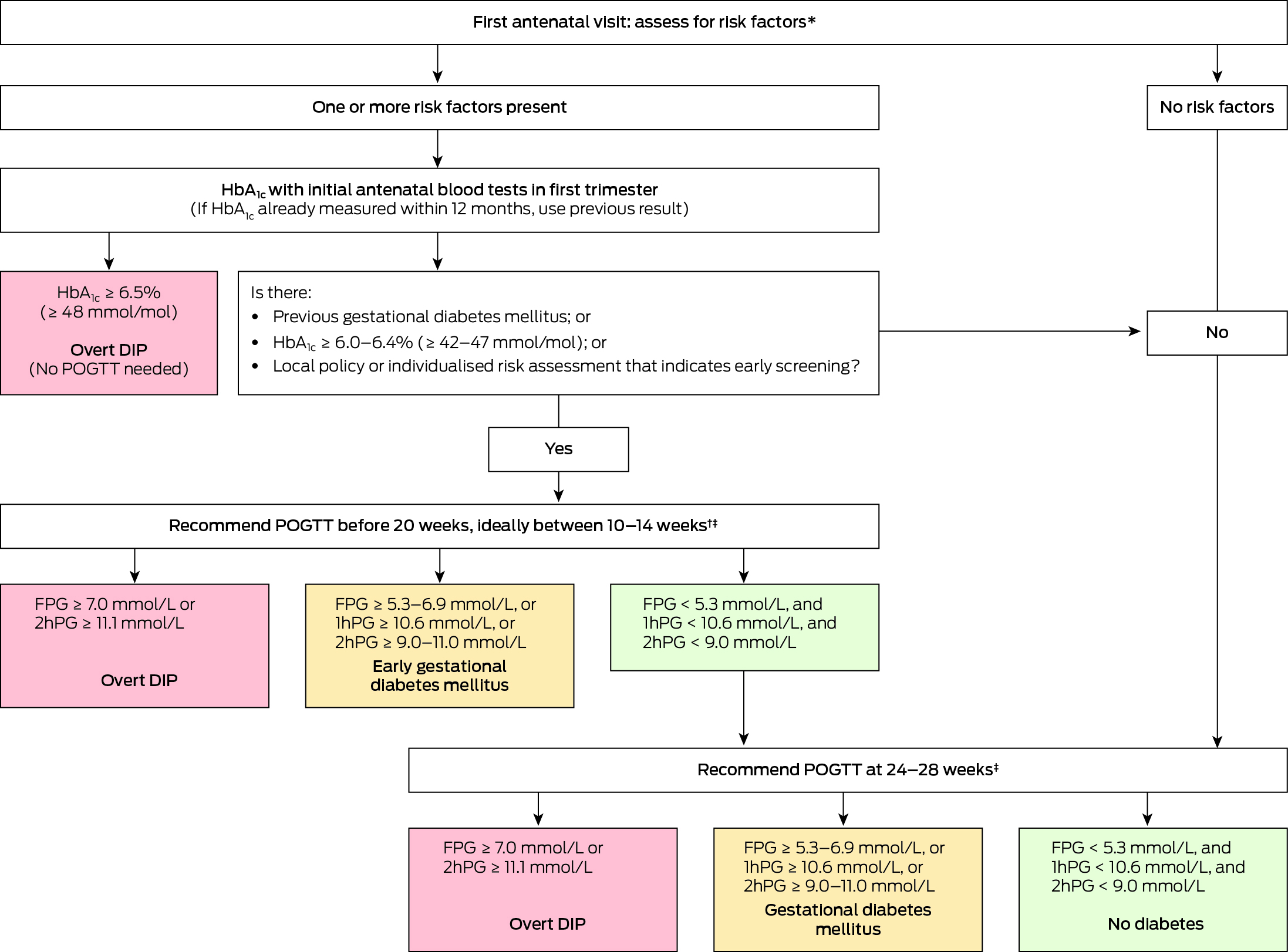 1hPG = one‐hour plasma glucose; 2hPG = two‐hour plasma glucose; BMI = body mass index; DIP = diabetes in pregnancy; FPG = fasting plasma glucose; HbA1c = glycated haemoglobin; POGTT = pregnancy oral glucose tolerance test. * See Box 2. † POGTT (ie, 75 g two‐hour oral glucose tolerance test) not recommended before ten weeks’ gestation but should be before 20 weeks’ gestation. ‡ See main text for options when POGTT is not tolerated or declined.