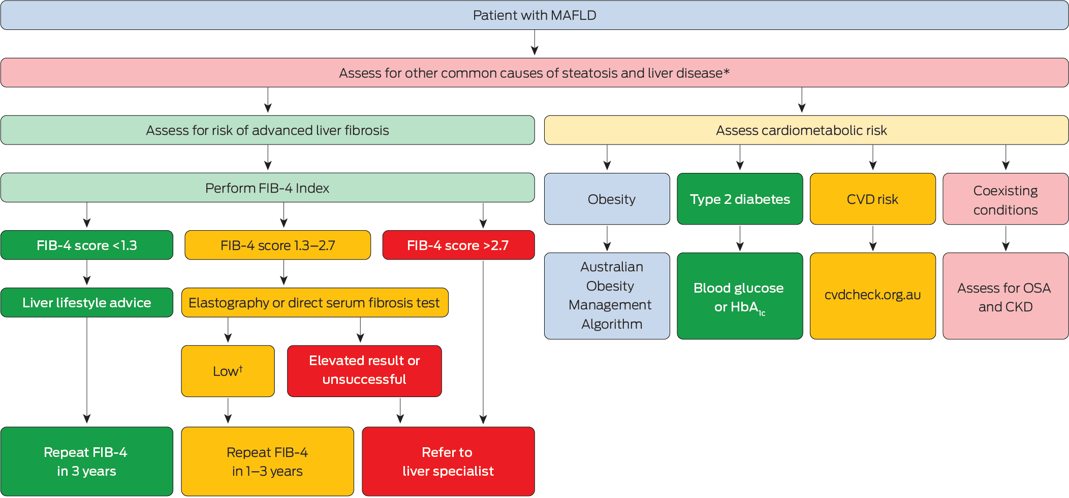 Main recommendations: Adults with type 2 diabetes, obesity or two or more other metabolic risk factors should be tested for MAFLD. Hepatic steatosis should be evaluated using ultrasound, whereas the presence and complications of type 2 diabetes and obesity should be assessed according to current Australian guidelines. Cardiovascular disease, chronic kidney disease and obstructive sleep apnoea are common in people with MAFLD and should be considered as part of a holistic health assessment. Alternative causes of hepatic steatosis, including excess alcohol consumption, must be considered, and patients with elevated serum aminotransferase levels should be tested for hepatitis B and C infection and iron overload. The risk of advanced liver fibrosis requires assessment using the Fibrosis‐4 (FIB‐4) Index; a low score (< 1.3) is associated with a more than 95% negative predictive value for advanced liver fibrosis. People with an indeterminate FIB‐4 score (between 1.3 and 2.7) should undergo second‐line assessment with liver elastography or a direct liver fibrosis serum test or, if these tests are unavailable, should be referred to an expert clinician in liver disease. People with MAFLD and a high FIB‐4 score (> 2.7), an elevated direct liver fibrosis serum test, high elastography results or with clinical, laboratory or imaging evidence of cirrhosis should be referred for further evaluation. Individuals with a low FIB‐4 score (< 1.3), low elastography or direct liver fibrosis serum test results should be monitored with a repeat FIB‐4 test at least every three years. Monitoring of weight, body mass index and/or waist circumference and for emergence of type 2 diabetes (in individuals without) should be performed at least annually.