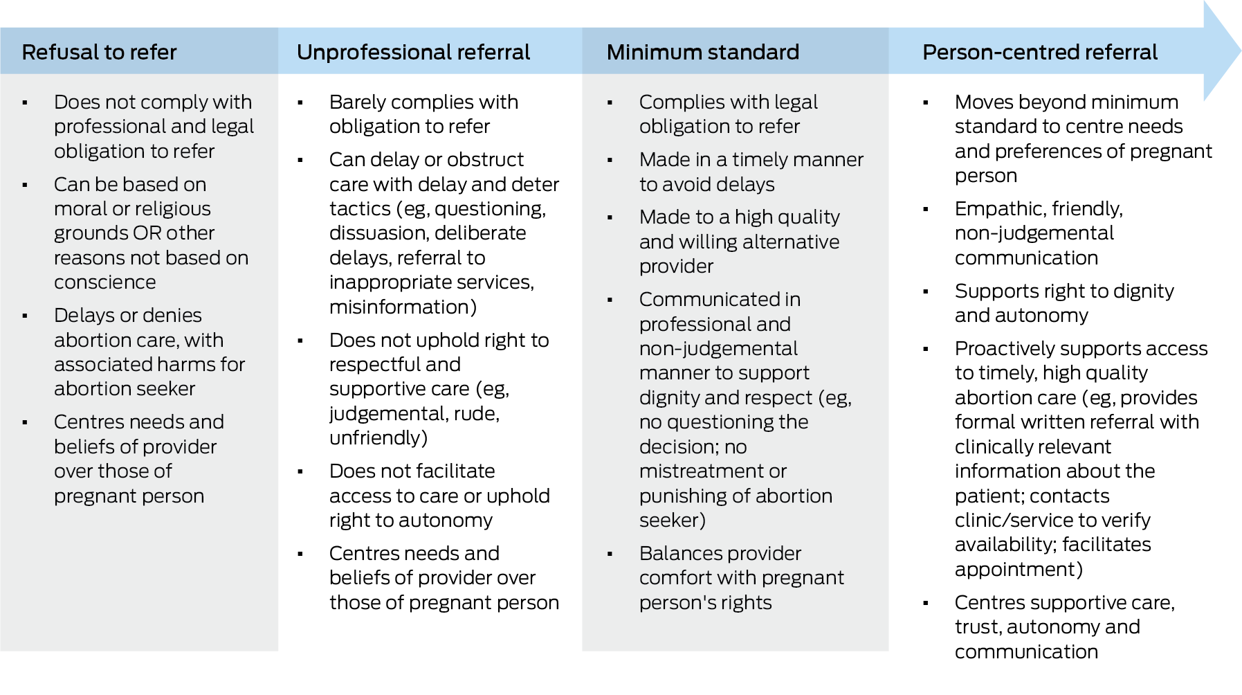 Applying principles of medical professionalism to abortion referrals, we present a spectrum of practices, from refusal to refer to person‐centred referral, and propose a minimum standard for professional abortion referral (Box 2).