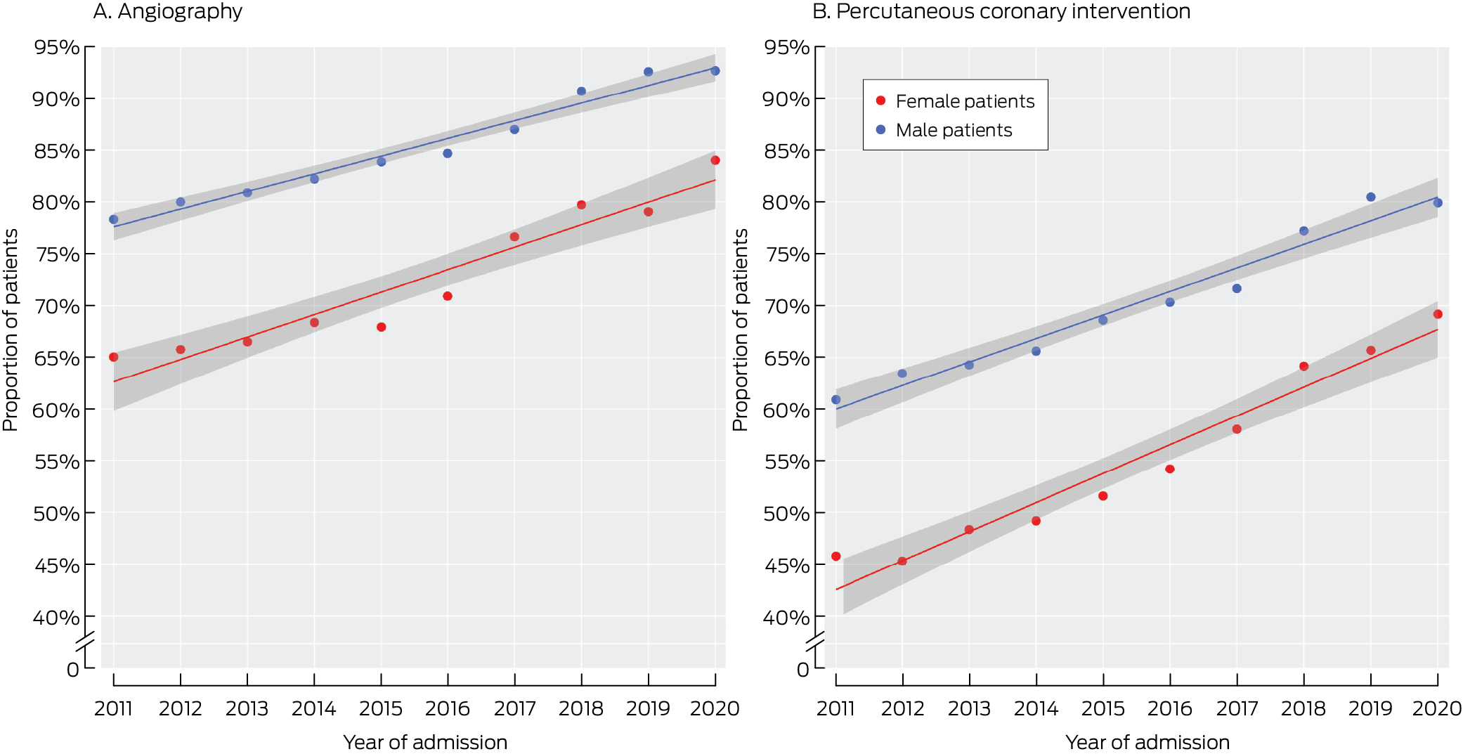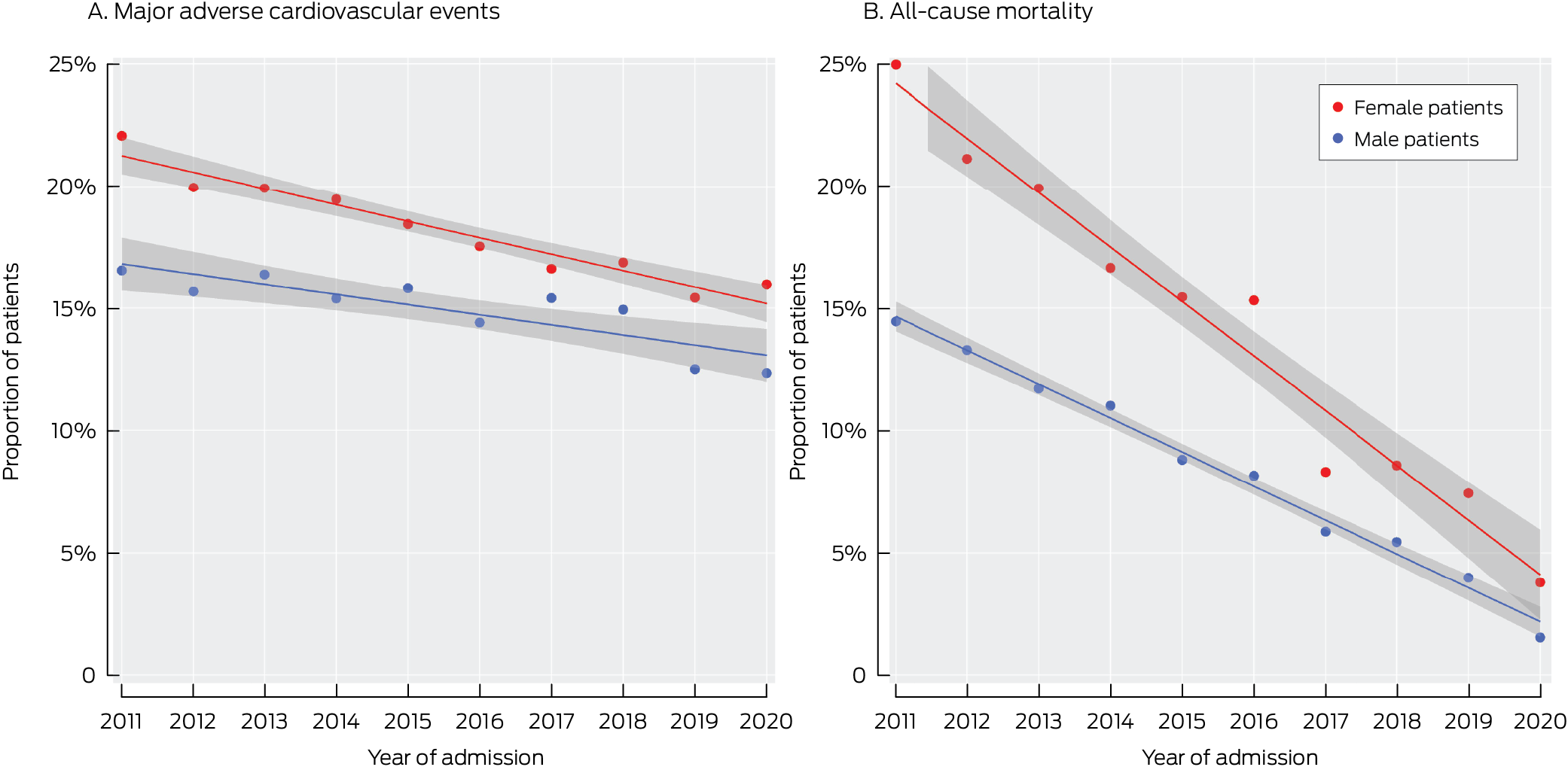 Results: We identified 29 435 initial STEMI hospital admissions during 2011–2020; the mean age at admission was 66.1 years (standard deviation, 14.2 years), 8475 patients were women (28.8%) and 20 960 were men (71.2%). The proportions of female patients who underwent angiography (71.9%v 85.1%) or PCI (54.4% v 70.0%) were smaller than those of male patients. During 2011–2020, the increase in the angiography proportion was greater for female than for male patients (2.7 [95% confidence interval {CI}, 2.5–2.9] v 1.5 [95% CI, 1.4–1.6] percentage points per year), as was the change in PCI proportion (3.2 [95% CI, 2.9–3.6] v 2.5 [95% CI, 2.3–2.7] percentage points per year). The proportions of admissions followed by MACE (18.4% v 15.0%) or death of any cause (14.7% v 8.5%) were larger for female than male patients. The decline in the MACE proportion during 2011–2020 was similar for female and male patients (0.8 [95% CI, 0.5–1.1] v 0.5 [95% CI, 0.3–0.7] percentage points per year); the decline in all‐cause mortality was greater for female than male patients (1.0 [95% CI, 0.8–1.1] v 0.6 [95% CI, 0.5–0.7] percentage points per year).
