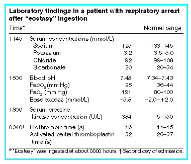 Introduction | Recent deaths associated with ingestion of the illicit drug "ecstasy" have attracted widespread publicity and debate about the cause of death. Ecstasy (3,4-methylenedioxymethamphetamine; MDMA) is an ampheta mine derivative which has short-term hallucinogenic and stimulant effects, but in the long term may deplete brain serotonin by reducing numbers of serotonergic nerve terminals.1 Previous ecstasy-related deaths have involved hyperthermia, rhabdomyolysis, coagulopathy and cardiac toxicity.2 We report a death after ecstasy ingestion associated with hyponatraemia, a less well known complication. |