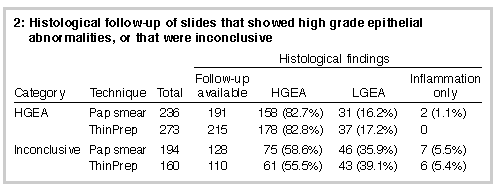 We received 35 560 paired split-sample conventional Pap smear slides and TP samples for analysis in this study. Box 1 presents a comparison of final (i.e., reviewed) results for TP and conventional Pap smear slides. Of the 34 141 paired results that were satisfactory for both slides, 32 195 (94.3%) showed total agreement and 1946 (5.7%) did not. Of the latter group, the TP slide showed a more severe abnormality than the conventional slide in 1194 (61.4%), and the opposite was true in 752 (38.6%; chi-squared = 100.4; df = 1; P < 0.001). For the 1946 paired slides which did not show total agreement, 271 had substantial discrepancies in which colposcopy would have been recommended based on the result of one test, but not the other. Of these, colposcopy would have been recommended on the basis of the TP result alone for 167 (61.6%), and on the basis of the conventional Pap smear result alone for 104 (38.4%; chi-squared = 14.6; df = 1; P < 0.001). Significant abnormalities were detected in 724 conventional smears. An additional 85 significant abnormalities were detected on TP slides for which the corresponding conventional slides, even after review, were either negative (78) or unsatisfactory (7). This represents a 12% increase in the detection of significant abnormalities. There were 14 TP slides that predicted high-grade epithelial abnormality (HGEA), while the corresponding conventional smears were either negative or unsatisfactory. Histological follow-up of 11 of these confirmed HGEA in eight, and low-grade epithelial abnormality (LGEA) in three. There were also 27 TP slides reported as inconclusive, while the corresponding conventional smears were either negative or unsatisfactory. Histological follow-up of 17 of these showed HGEA in seven, LGEA in eight, and inflammation in only two. Further, 15 conventional smears originally reported as negative, and reviewed because their TP counterparts showed an abnormality, were subsequently reported as HGEA or inconclusive. These "screening" false negatives are not represented in Box 1, which shows only final results (i.e., after review). ThinPrep slides not only increased detection of abnormalities, but also influenced management recommendations. On the basis of conventional smear tests, the recommendations for 1669 women (4.7%) with minor non-specific changes or features of human papillomavirus (HPV) effect were "repeat smear in 12 months" or "...six months", respectively. For 89 of these women (5.3%), this recommendation was changed to "colposcopy" as a result of a higher grade abnormality being detected on the TP slide. Histological follow-up concentrated on the predicted HGEA and inconclusive categories. Findings are shown in Box 2 (below).
