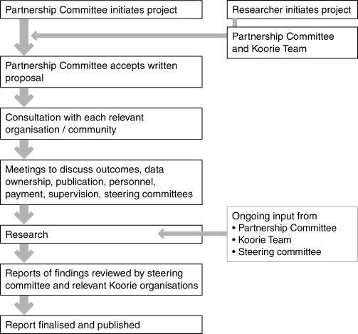 The usual university ethics approval is still required.21,22 Ethics committees have agreed on requirements to date, including steering committees, employing Koories, storage of data with the Koorie Team, written consent, the role of the partnership committee, ongoing consultation and approval of all reports. Our framework extends general ethical requirements, calling for research to be culturally sensitive and accepted as necessary and useful by the communities of the participants. This gives communities the power to decide what research should be undertaken, a voice on how research is conducted, and control over presentation of the findings.