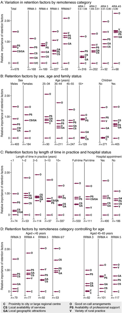 D: Retention factors by age and rurality or remoteness. Because of small numbers, only two age groups were used.