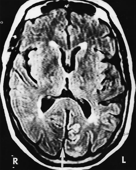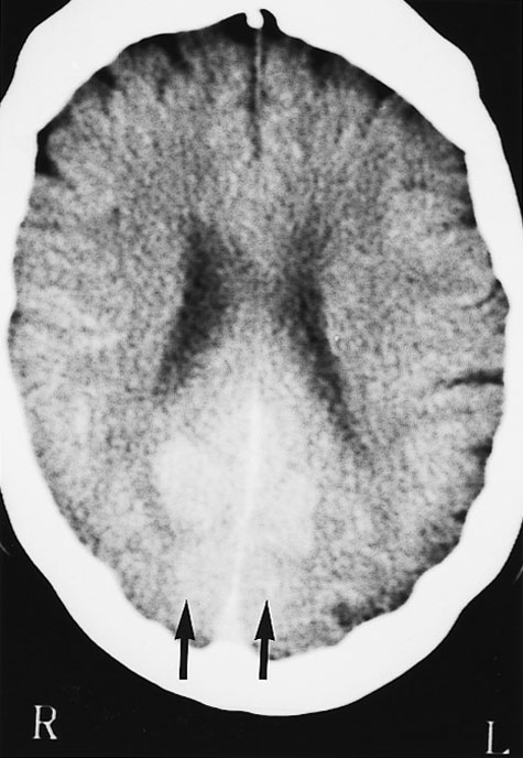 No additional contrast was given. There is marked bilateral contrast enhancement of the medial aspect of both occipital lobes in a symmetric distribution (arrows).