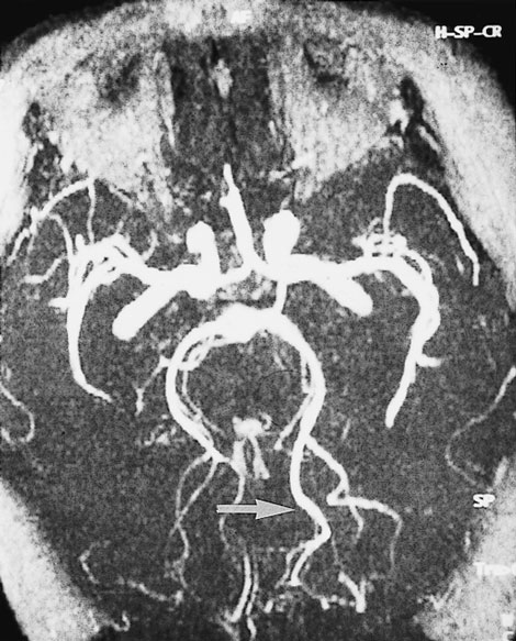 B: A magnetic resonance angiogram (MRA) at the same time shows that both posterior cerebral arteries are patent. The peripheral branches on the left side are larger (arrow).