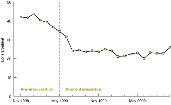 Primary outcome variables for the study were compared using Student's t test. Mean values, percentage difference, P value and 95% confidence intervals for the pre- and post-intervention cost/patient were calculated. Statistical analysis used the STATA 6.0 statistical package.11