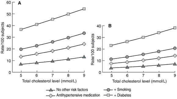 For a given age and cholesterol level, CVD risk over 5 years is doubled in the presence of antihypertensive medication or diabetes, increased by 50% with cigarette smoking, and halved in women compared with men.