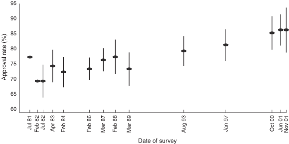 The aggregate percentage of approvals for the July 1982–January 1997 surveys was 74.8% (95% CI, 73.0%–76.6%), compared with 85.6% (95% CI, 83.0%–88.2%) for the October 2000–November 2001 surveys. The 10.8 percentage-point increase in approval rate (accompanied by a fall in disapproval rate) corresponds to an OR of 2.0 (95% CI, 1.6–2.6).