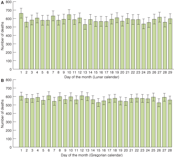 Results: There were 17 346 cardiac deaths registered under ICD-9 codes 410–414 in 1995–2000. The mean (+ 1 SD) of the cumulative number of cardiac deaths on each day of the month was 587 (+ 30) for the Gregorian calendar or 573 (+ 24) for the Lunar calendar. The mean number of deaths on the 4th, 14th and 24th day of the month was not significantly different from the mean number of deaths on the remaining days of the month.