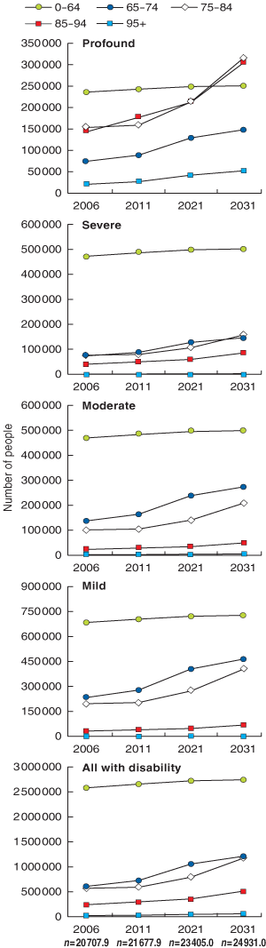 The projections indicated that the absolute numbers of people aged 0–64 years with some form of disability will rise only slightly. In contrast, for people aged over 64 years, projected increases in the number with disability are pronounced. The number of older people with profound disability arising from stroke, musculoskeletal, nervous system, circulatory and respiratory conditions, and conditions related to vision, are estimated to nearly double from 2006 to 2031.