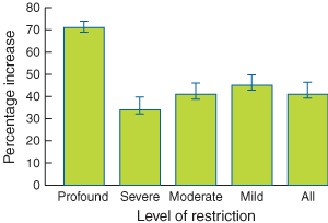 The most recent (1998) national Survey of Disability, Ageing and Carers (SDAC) in 1998 by the Australian Bureau of Statistics (ABS) estimated that 3.6 million Australians (19%) had some form of disability.3 Of these, 2.8 million (78%) had a core activity restriction — in self-care, mobility or communication — caused by their disability.4 The ABS further defines core activity restrictions as profound, severe, moderate or mild.3 People with a profound restriction are unable to perform a core activity, such as eating or dressing, or always require assistance from another person. People with severe restriction sometimes need assistance to perform a core activity, while those with moderate restriction do not need assistance but have difficulty performing a core activity. People with mild restriction use aids because of their disability, but have no difficulty in performing a core activity.