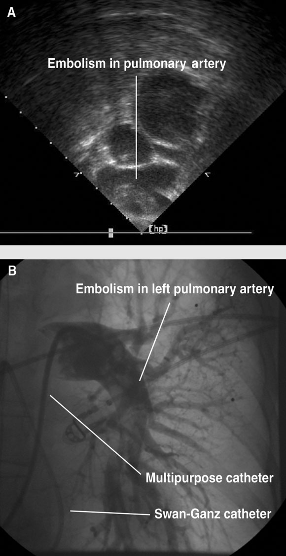 There are several reports of successful fragmentation of pulmonary emboli with improvised equipment in patients with shock.9 Our case is of particular interest, as thrombolysis had failed to improve the patient’s immediate clinical state. The use of a pulmonary flotation catheter to dislodge the embolism from the main pulmonary artery proved to be a useful temporising measure. This type of catheter is easily passed without the need for fluoroscopic control. In this situation, transoesophageal echocardiography proved pivotal in diagnosing the embolism rapidly, and in monitoring the response to therapeutic manoeuvres.10 Movement of the embolism from the main pulmonary artery was visualised in real time, which may be better achieved with transoesophageal rather than transthoracic imaging. Further mechanical fragmentation could then be achieved in the catheterisation laboratory. The technique consists of fragmentation of central emboli and dislocation of the fragments to the periphery, resulting in a relative gain of non-obstructed, cross-sectional artery area. Moreover, the increased total surface area of the fragments may ac-celerate the efficacy of concurrent thrombolysis.