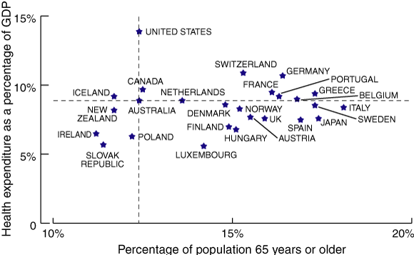 More specifically, across the countries belonging to the Organisation for Economic Co-operation and Development (OECD), ageing of the population is not related to health expenditure as a proportion of GDP (Pearson’s correlation coefficient, 0.11; 95% CI, − 0.29 to 0.48; P = 0.59). The Box shows health expenditure by proportion of population aged 65 years or older in 26 OECD countries. All the countries in the lower right-hand quadrant have populations with a greater proportion of older people than in Australia, but they spend less on health as a percentage of GDP. Most have similar, if not better, health outcomes, as measured by life expectancy. For example, in the year 2000, 17.3% of the Swedish population were aged 65 years or older, but that country spent only 8.6% of its GDP on health. This is less than the 9.3% spent by Australia in 2001–02, when only 12.7% of the population was 65 years or older. The proportion of the Australian population aged 65 years or older will not exceed 17% until the year 2020.