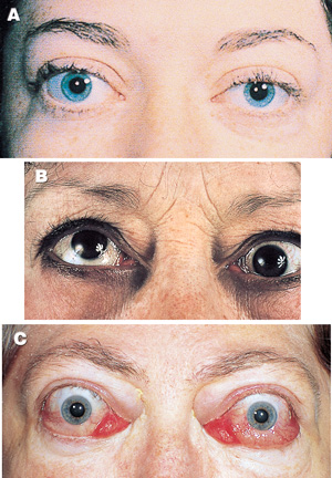 Graves disease is caused by stimulation of the thyroid by antibodies which bind to TSH receptors and mimic the effect of prolonged TSH stimulation. These TSH-receptor antibodies result from abnormal immunoregulation permitting generation and expansion of clone(s) of antibody-producing cells in genetically predisposed individuals with specific HLA-D subtypes.5 Spontaneous exacerbations and remissions of Graves disease can occur. The environmental triggers are still not well characterised, but postpartum exacerbation is common, and such a history should be sought routinely when Graves disease is diagnosed. Excess iodine can precipitate active Graves disease by providing more substrate for hormone synthesis and possibly also by disturbing immune function. Persistence or recurrence of Graves disease is more likely when there is a previous history of recurrent disease, in the presence of a large goitre, when T3 excess persists despite control of T4 with thionamide therapy, and when TSH-receptor antibody persists during thionamide therapy. In addition to hyperthyroidism, other autoimmune manifestations of Graves disease are Graves ophthalmopathy (Box 3) and Graves dermopathy (pretibial myxoedema). Autoimmune thyroid disease is associated with some other, less common, autoimmune diseases, including pernicious anaemia and Addison’s disease.