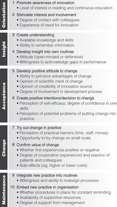 Other models describe the stepwise change process that individuals need to undergo to alter their behaviour. “Stages-of-change” theories5-8 have mostly been used to distinguish between patients with different degrees of motivation to adopt better lifestyles, but are increasingly being used in research of implementation strategies. However, a systematic review of stage-based interventions has found only limited evidence for their effectiveness.9 Integrating various stages-of-change theories, we have compiled a 10-step model for inducing change in professional behaviour (Box 3). Studies are under way to test the validity of these steps.