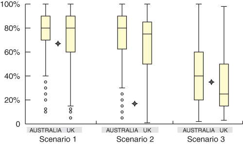 UK respondents’ results were similar to the Australian results for Scenarios 1 and 2, with 48% and 12%, respectively, being within 20 percentage points of the correct estimate. However, UK respondents scored significantly better than Australian respondents for Scenario 3, with 65% being within 20 percentage points of the correct estimate (χ2 = 24.2; P < 0.001).