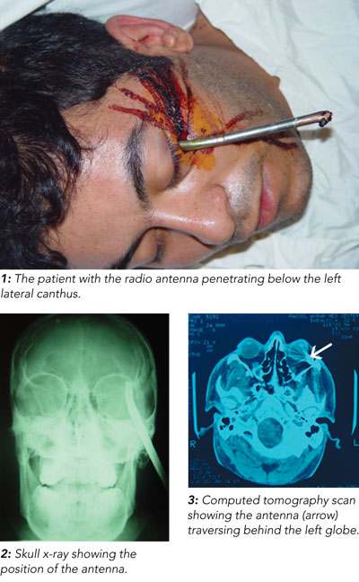Penetrating intracranial foreign bodies at low velocity characteristically enter via the orbital roof, the temporal squama or the cribriform plate. In this case, the antenna penetrated the orbital roof — one of the thinnest areas of cranial bone — without injury to the globe of the eye, or any neurological complications.