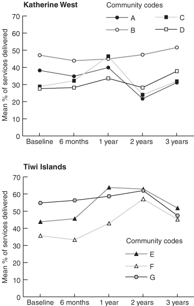 Trends in service delivery varied between communities (Box 3). In all three Tiwi communities there was an increasing trend to Years 1 and 2, followed by a decline to Year 3. In two of these communities, the overall increasing trend was statistically significant. In Katherine West there was more variation between communities. A striking feature of the patterns was the sharp decline in two communities between Year 1 and Year 2. For one of these communities, the overall trend was a statistically significant decline.