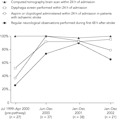 The key process measures selected for the stroke pathway were the proportions of (a) patients who had a computed tomography (CT) brain scan within 24 hours of admission; (b) patients who were screened for dysphagia within the first 24 hours of admission; (c) patients with ischaemic stroke who were given aspirin or clopidogrel within 24 hours of admission; and (d) patients who underwent regular neurological observation during the first 48 hours after the stroke.