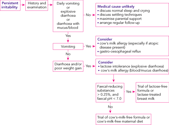 For most irritable infants, there is no underlying medical cause. In a minority, the cause is cow’s milk and other food allergy. Only if frequent vomiting (about five times a day) occurs is gastro-oesophageal reflux a likely cause.
