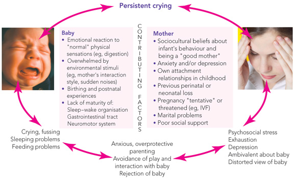 Infant behaviour needs to be understood in the context of the emotional development of the infant and the developing infant–parent relationship. Social and cultural beliefs, the “psychological style” of the parents (eg, degree of emotional responsivity, ability to deal with an infant’s total dependence), as well as the parents’ own childhood experiences, all influence how parents react and respond to persistent infant crying. The demands of fertility treatments may result in a tentative pregnancy and parents do not dare become too attached to the fetus. They may then be overwhelmed and unprepared for the reality of caring for a baby. Grief from previous neonatal loss may resurface with the birth of an infant, and it may be hard for parents to be convinced that this baby will be healthy and survive. Finally, postnatal anxiety or depression may impair a mother’s capacity to read her infant’s emotional states and behavioural cues. This may lead to soothing strategies not in tune with the infant’s state, a paucity of appropriate interaction and play opportunities, and a blunted emotional response to the infant.
