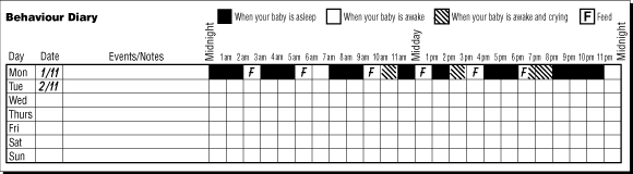 Parents can use a simple diary to record their baby’s crying, feeding, and sleeping patterns on a daily basis (Box 4). A diary can show the baby’s usual crying patterns, the total amount of sleep the baby is having per 24 hours, and can help parents and doctors monitor the response to settling techniques. Most parents enjoy completing a diary. In some cases a diary can help them solve the problem by, for example, recognising that their baby sleeps better if he or she is awake for longer periods between daytime sleeps.