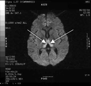 2 Magnetic resonance imaging (T1-weighted, T2-weighted axial, and diffusion-weighted image, respectively), with arrows showing bilateral symmetrical thalamic hyperintensities with restricted diffusion. Bilateral thalamic ischaemia is most often seen in thiamine deficiency.