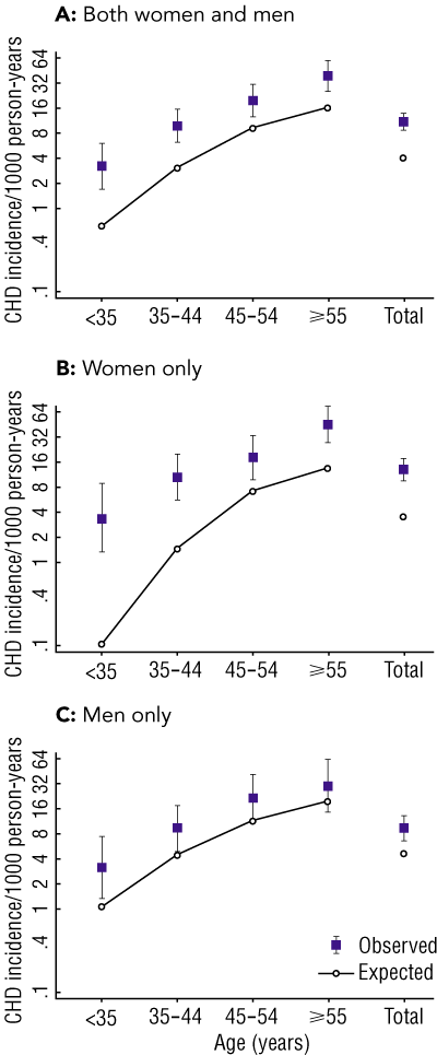 Methods: An original Framingham function was used to predict CHD risk according to the duration of follow-up and the values of traditional risk factors, which included age, sex, total cholesterol level, high-density lipoprotein (HDL) cholesterol level, blood pressure, the presence of diabetes, and smoking status. The predicted CHD incidence using the Framingham function was 4.4 per 1000 person-years, while the observed incidence was 11.0 (95% CI, 8.7–13.9) per 1000 person-years. The observed number of CHD events (68) was 2.5 times the number predicted (27) using the Framingham function. The observed incidence was about four and three times the predicted incidence for age groups < 35 and 35–44 years, respectively, and about twice the predicted incidence for those over 45 years of age. The Framingham function was a particularly unreliable predictor for women, especially younger women, in whom the observed CHD rate was 30 times the predicted rate.
