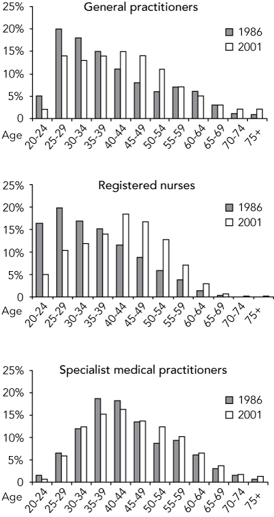 Main outcome measures: Age distribution of GPs, specialists and nursing workforce; attrition rates as GPs, specialists and nurses left the workforce; and hours worked according to age group.