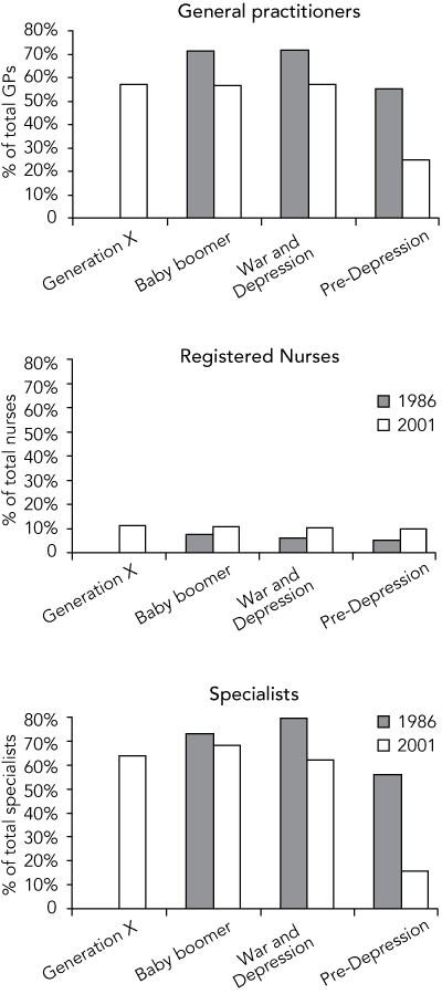 Results: The age profile of the GP, specialist and nursing workforce has aged since 1986 (P < 0.001), with the “baby boomer” generation making up more than half the workforce in 2001. A large proportion of GPs continued to work beyond the traditional retirement age of 65 years, with nurses retiring at a younger age than doctors (P < 0.001). All GP cohorts worked fewer hours in 2001 than they did in 1986 (P < 0.001), with “generation X” GPs working fewer hours than the baby boomers did at the same age (P < 0.001).