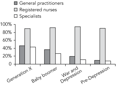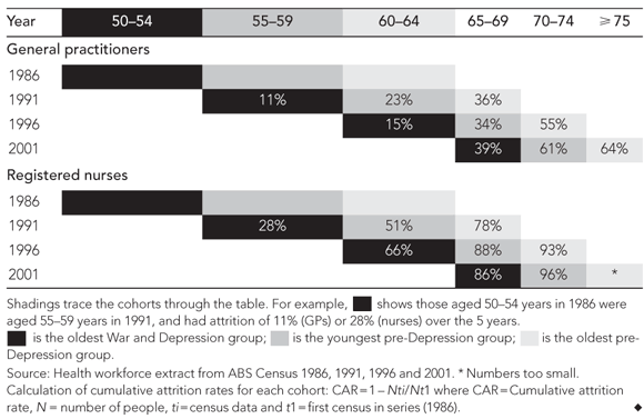 With the rapid ageing of the medical workforce, patterns of attrition become critical to the workforce age structure. The cumulative attrition rate of the “pre-Depression” and “War (World War II) and Depression” cohorts from 1986 to 2001 were examined. Most notable was the earlier retirement of nurses compared with GPs (P < 0.001) (Box 3).