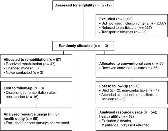 A total of 375 patients met the eligibility criteria for the study and 113 (30%) of these were randomised between rehabilitation (= 57) and conventional care (= 56). The randomised groups were well balanced for baseline characteristics (Box 1). For various reasons, the remainder elected not to participate: no interest (105), a perception that rehabilitation was unnecessary or inconvenient (90), immediate return to work (42), and transport difficulties (25). Another 2337 (86%) screened subjects were considered ineligible: 1347 resided outside the area health service, 397 were aged > 75 years, 285 had a comorbidity, 255 had insufficient English literacy, 25 had a definite indication for rehabilitation (and were subsequently referred), 23 were not interviewed, and five were in deteriorating health (Box 2).