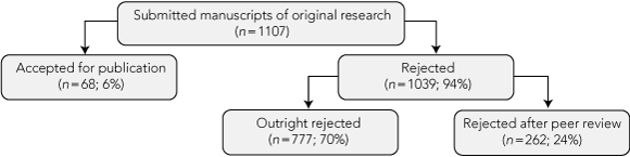 During the study period, 1107 manuscripts meeting eligibility criteria were submitted to the three journals. Sixty-eight (6%) were accepted for publication, 777 (70%) were rejected outright and 262 (24%) were rejected after peer review (Box 1).