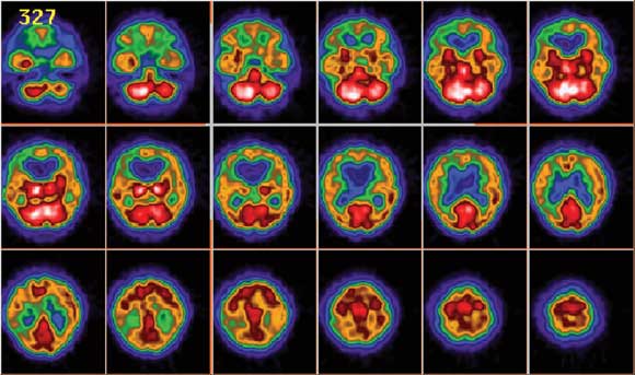 Magnetic resonance imaging (MRI) scans of the brain showed ventricular enlargement, supratentorial white-matter hyperintensities, and extensive leptomeningeal enhancement in the posterior fossa, brain stem and basal cisterns, with extension along the cranial nerves (Figure 1). The MRI results were reported as consistent with neurosarcoidosis. A SPECT (single-photon emission computed tomography) scan, undertaken to differentiate possible causes of dementia, demonstrated global hypoperfusion (Figure 2).
