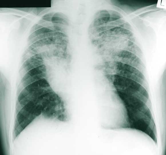 A number of measurements showed that the patient’s sarcoidosis was stable: serum angiotensin-converting enzyme and 24-hour urine calcium levels were normal; respiratory function testing showed moderate air flow obstruction and gas transfer, with no change from previous measurements; and a chest x-ray (Figure 3) showed no new changes.