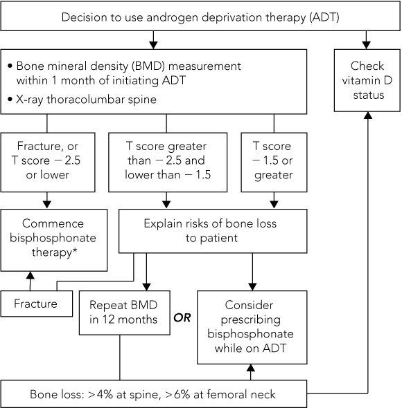 Box 3 shows a flow diagram we have developed to assist in monitoring and treatment of patients receiving ADT. Validation of our recommendations awaits prospective randomised controlled trials of reduction in fracture rates with therapy in patients treated with ADT, and not just prevention of bone loss as measured by BMD. In the interim, we encourage all doctors to monitor bone health in patients treated with ADT to minimise the impact of this therapy on bone loss, and to prevent morbidity in long-term prostate cancer survivors.