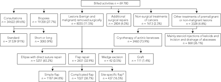 Results: Of 69 780 billed activities, 34 622 (49.6%) were consultations, 19 358 (27.7%) biopsies, 8055 (11.5%) surgical excisions, 2804 (4.0%) additional surgical repairs, 1613 (2.3%) non-surgical treatments of cancers and 3328 (4.8%) treatments of premalignant or non-malignant lesions. A total of 6438 cancers were treated (116 melanomas by excision, 4709 non-melanoma skin cancers [NMSCs] by excision, and 1613 NMSCs non-surgically); 5251 (65.2%) surgical wounds were repaired by direct suture, 2651 (32.9%) by a flap (of which 44.8% were simple flaps), 42 (0.5%) by wedge excision and 111 (1.4%) by grafts. The CBR was 1.79, the BTR was 3.1 and the NNT was 28.6.