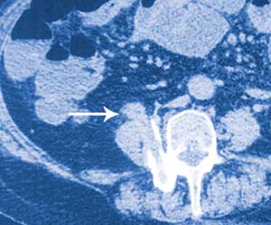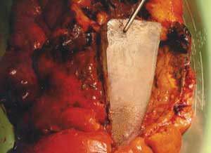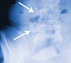 The abdominal radiograph was reviewed the day after clinical presentation and surgery. It was noticed that there was partial bony fusion of the right transverse processes of the fourth and fifth lumbar vertebral bodies. A CT scan confirmed that new bone formation at this level had produced a solid block of bone with a central defect in the shape of a rectangle. It is thought that the glass fragment snapped off deep to the skin and fractured the right transverse processes of L4 and L5, with the subsequent fracture healing process giving rise to a perfect bony cast of the fragment. It is well documented that a fracture initiates a sequence of inflammation, repair and remodelling, and that the remodelling process continues for years.1 Another CT scan showed the bony tract caused by the glass fragment projecting anteriorly into the right psoas muscle. Directly anterior to this, the terminal ileum could be seen lying on the anterior surface of the right psoas muscle (Figure, C). It is thought that the sharp end of the glass fragment gradually worked its way out the front of the psoas muscle and into the terminal ileum.