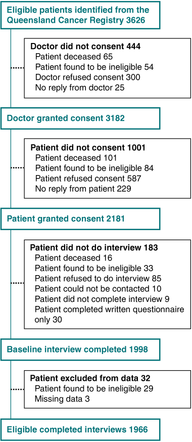 A flow diagram describing recruitment to, and participation in, the study is presented in Box 1. The treating doctors of 3626 eligible patients were approached in writing for permission to contact their patients regarding the study. Letters were re-sent to non-responding doctors 2 weeks after the initial mailing, and doctors were then telephoned weekly until an answer was received.