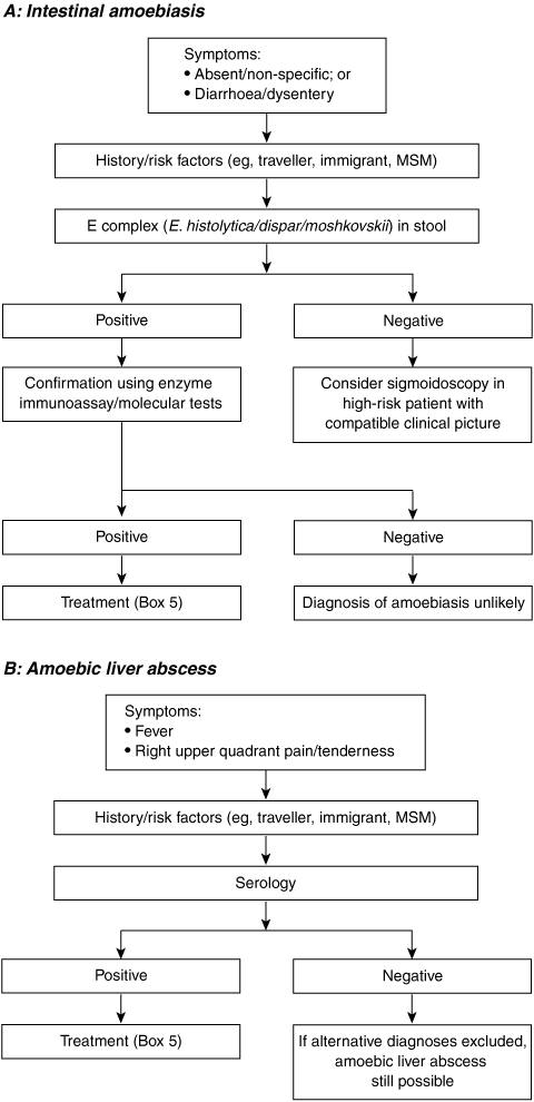 The diagnosis of amoebiasis is confirmed either by detecting E. histolytica parasites in the faeces or by detecting an antibody response to the parasite in the serum (Box 3, Box 4).