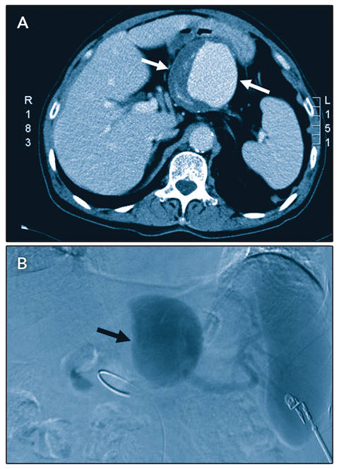A 70-year-old man had a 1-year history of intermittent abdominal distension. Abdominal ultrasound examination showed a cystic lesion near the pancreas. Contrast computed tomography scans showed a large aneurysm (Figure A, arrows) about 80 × 70 mm in size. Angiography of the coeliac and splenic arteries confirmed the diagnosis of a giant splenic artery aneurysm (Figure B, arrow). The aneurysm was surgically ligated and excised, and the spleen was removed. The postoperative course was uneventful. Splenic artery aneurysms larger than 80 mm are rare.1 Open ligation or embolisation should be considered for symptomatic aneurysms, aneurysms ≥ 2 0 mm in size, or any splenic artery aneurysm in a woman of childbearing age.2