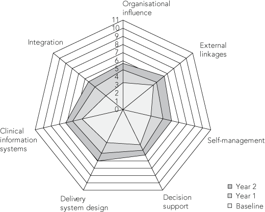 Firstly, an adapted version of the Assessment of Chronic Illness Care (ACIC) scale16 was used to evaluate the state of health centre system development with regard to prevention and management of chronic illness. The adapted version of the scale included 34 items that were grouped into seven components (six as outlined in the CCM, plus an integration component). Based on health centre staff consensus, each item was given a score indicating the state of development, ranging from 0 (not at all) to 11 (fully developed).17,18 The mean was calculated from individual item scores to create a component score, and the mean of the seven component scores formed the overall system score for the community health centre. The scale served both as a measurement tool and an intervention tool, as the discussion of system components led to better understanding among staff of the quality of systems and consideration of how systems could be improved.