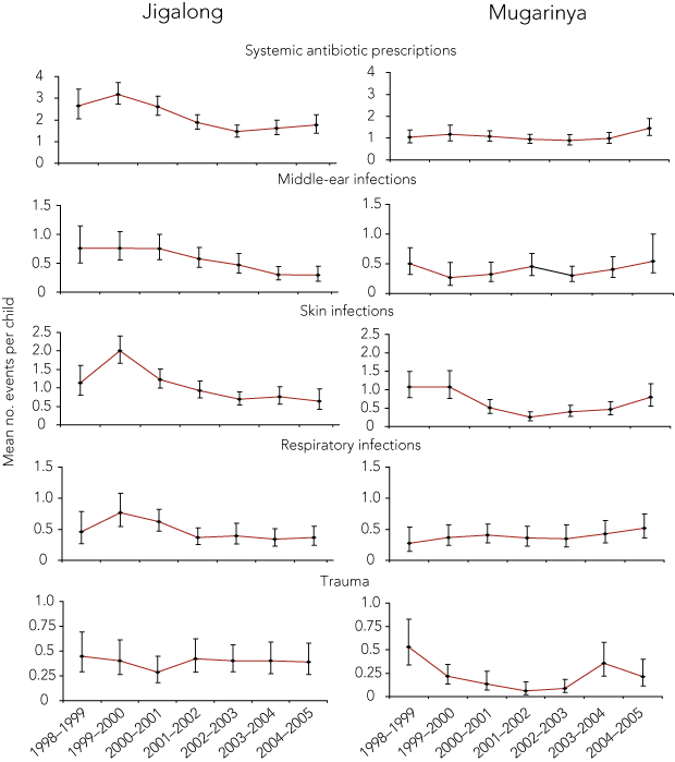 Log-linear trend analyses (Box 5) confirmed a significant decline in antibiotic prescriptions and infections in Jigalong from 1998 to 2005, irrespective of the selection method. In Mugarinya, trend analysis showed a decline in all skin infections, but no significant changes in rates of other infections, trauma-related events or antibiotic prescriptions.